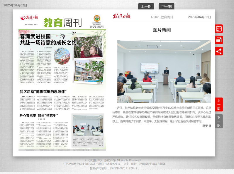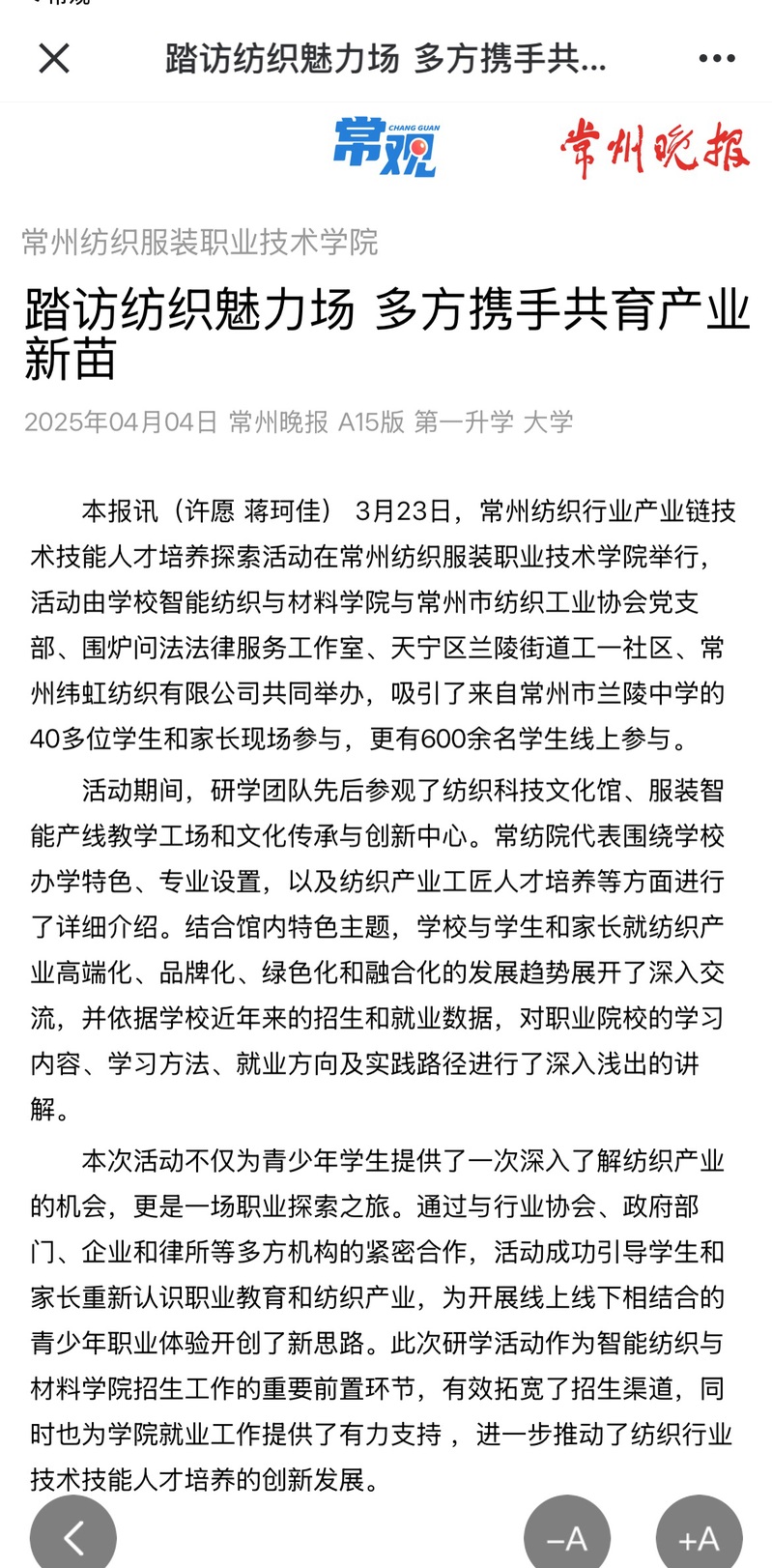 學雷鋒、做志愿、服務(wù)改革建新功——我校開展學雷鋒志愿服務(wù)月活動2025-04-07為深入貫徹落實習近平總書記關(guān)于弘揚雷鋒精神的重要論述,深刻把握雷鋒精神的時代內(nèi)涵,引領(lǐng)常紡青年在志愿服務(wù)實踐中大力弘揚“奉獻、友愛、互助、進步”的志愿服務(wù)精神,今年3月,以“學雷鋒、做志愿、服務(wù)改革建新功”為主題,系統(tǒng)部署開展2025年“學雷鋒”志愿活動月專項活動。通過組織全校師生開展30余場主題鮮明、形...省委第十巡視組巡視常州紡織服裝職業(yè)技術(shù)學院黨委工作動員會召開2025-04-04根據(jù)省委關(guān)于巡視工作的統(tǒng)一部署,2025年4月2日,省委第十巡視組巡視常州紡織服裝職業(yè)技術(shù)學院黨委工作動員會召開。省委第十巡視組組長李圣華作了動員講話,對深入學習貫徹習近平總書記關(guān)于巡視工作的重要論述、關(guān)于教育的重要論述和對江蘇工作的重要講話精神,認真貫徹落實全省巡視巡察工作會議暨對村巡察工作推進會、省委...